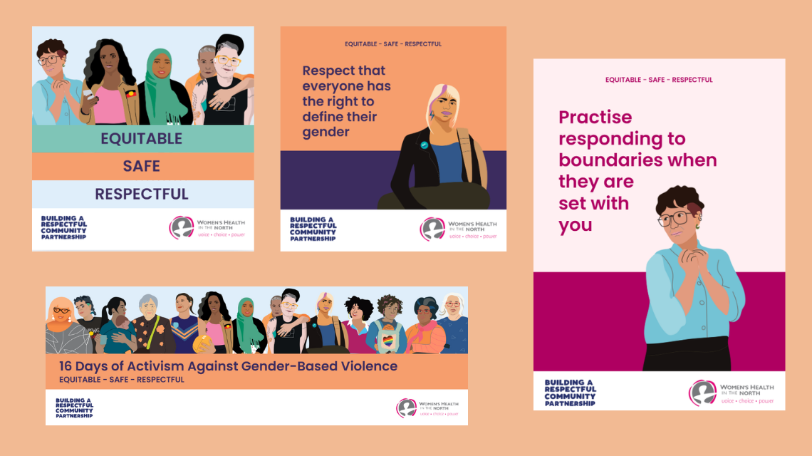 The Equitable, Safe, Respectful campaign features 17 messages with actions to promote gender equity, challenge gender stereotypes, condone gender-based violence, support reproductive choice and spotlight affirmative consent. The campaign highlights primary prevention work from the northern metropolitain region and beyond.