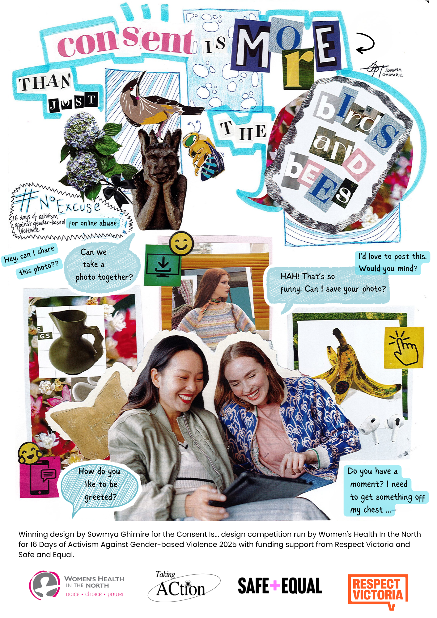 This poster titled, Consent in Everyday Situations, is the winning design by Sowmya Ghimire for the Consent Is… design competition run by WHIN for the 16 Days of Activism Against Gender-based Violence 2025. Sowmya’s poster design ‘Consent is More than just the Birds and the Bees’ was judged by a panel of young consent experts. The design explores digital consent to raise awareness about the 2025 UN Women 16 Days theme of ending digital violence against women and girls.